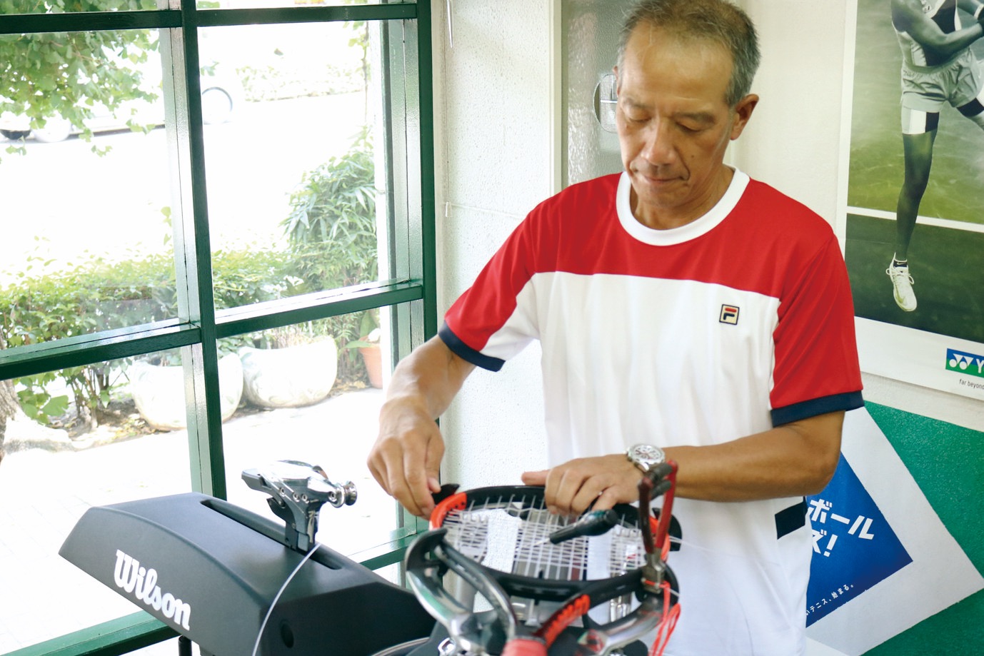 尾中弘明さんは、テニスプロショップを父親から継いだ二代目のストリンガー。自身も大学などでプレーヤー経験があり、現在は京都府テニス協会強化本部長も務めている。ラケットにストリングを張るときの一番大事なことを聞いてみた。「プレーしている間に絶対緩んでこないことでしょう」と尾中さん。ラケットのフレームにストリングをキチっと結びつける“コツ”が、選手との“信頼”をほどけなくする。