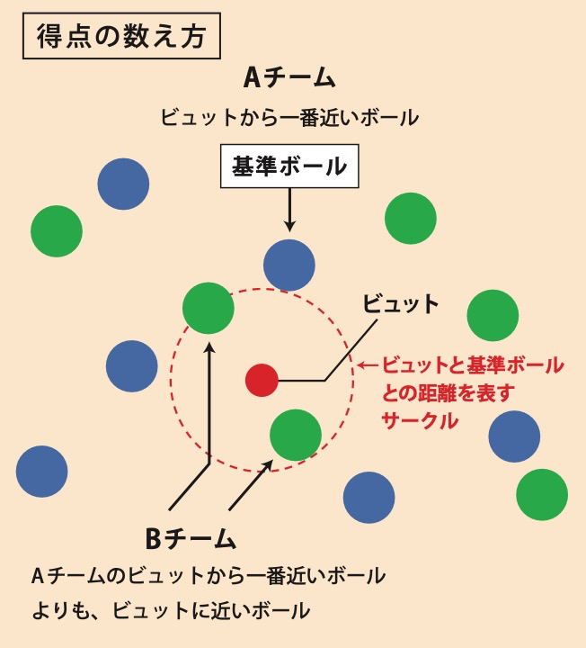 そして、Aチームの「基準ボール」よりもビュットに近いBチーム(緑)のボールが2つあります。この場合、Bチームに2点がはいります。